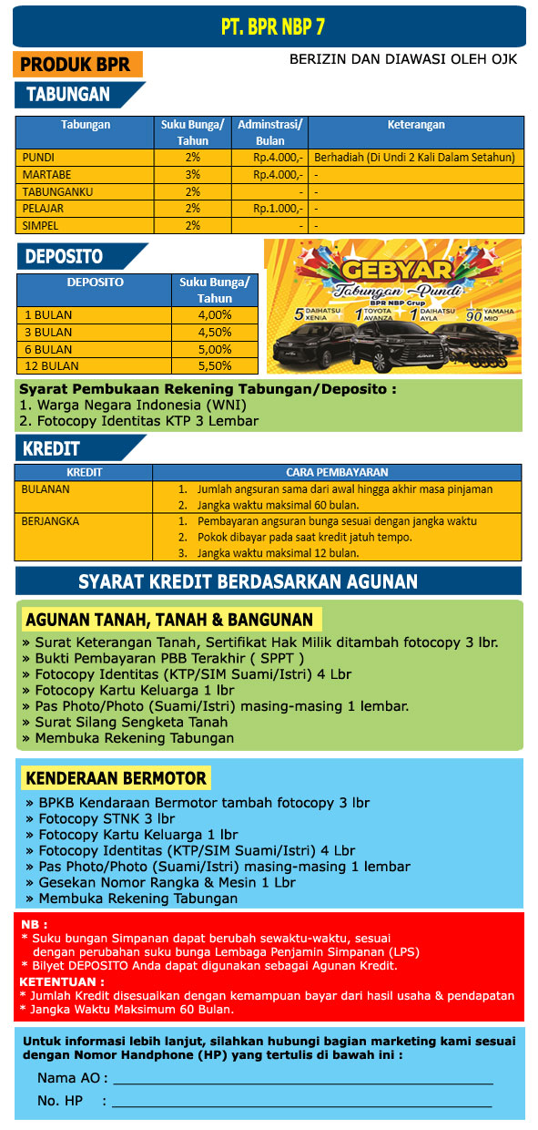 Bank NBP 7 Raya menghadirkan berbagai solusi keuangan yang dirancang untuk memenuhi kebutuhan Anda. Raih impian Anda dengan pinjaman cepat dan mudah, serta nikmati simpanan aman dengan keuntungan maksimal bersama Bank NBP 7 Raya.